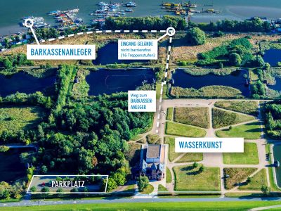 Um Ihnen den Zugang zum Wasserkunst-Gelände zu ermöglichen, ist eine vorherige Absprache mit der Wasserkunst Kaltehofe erforderlich. Der Fußweg bis zum Gelände der Wasserkunst beträgt ca. 680 m und ist nicht barrierefrei.