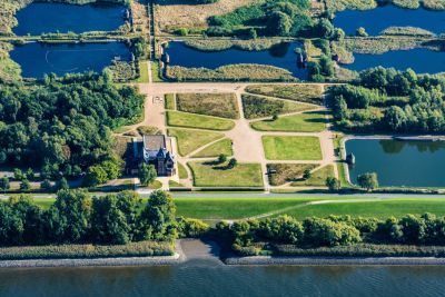 Blick vom Deich auf die Villa Kaltehofe und das Gelände